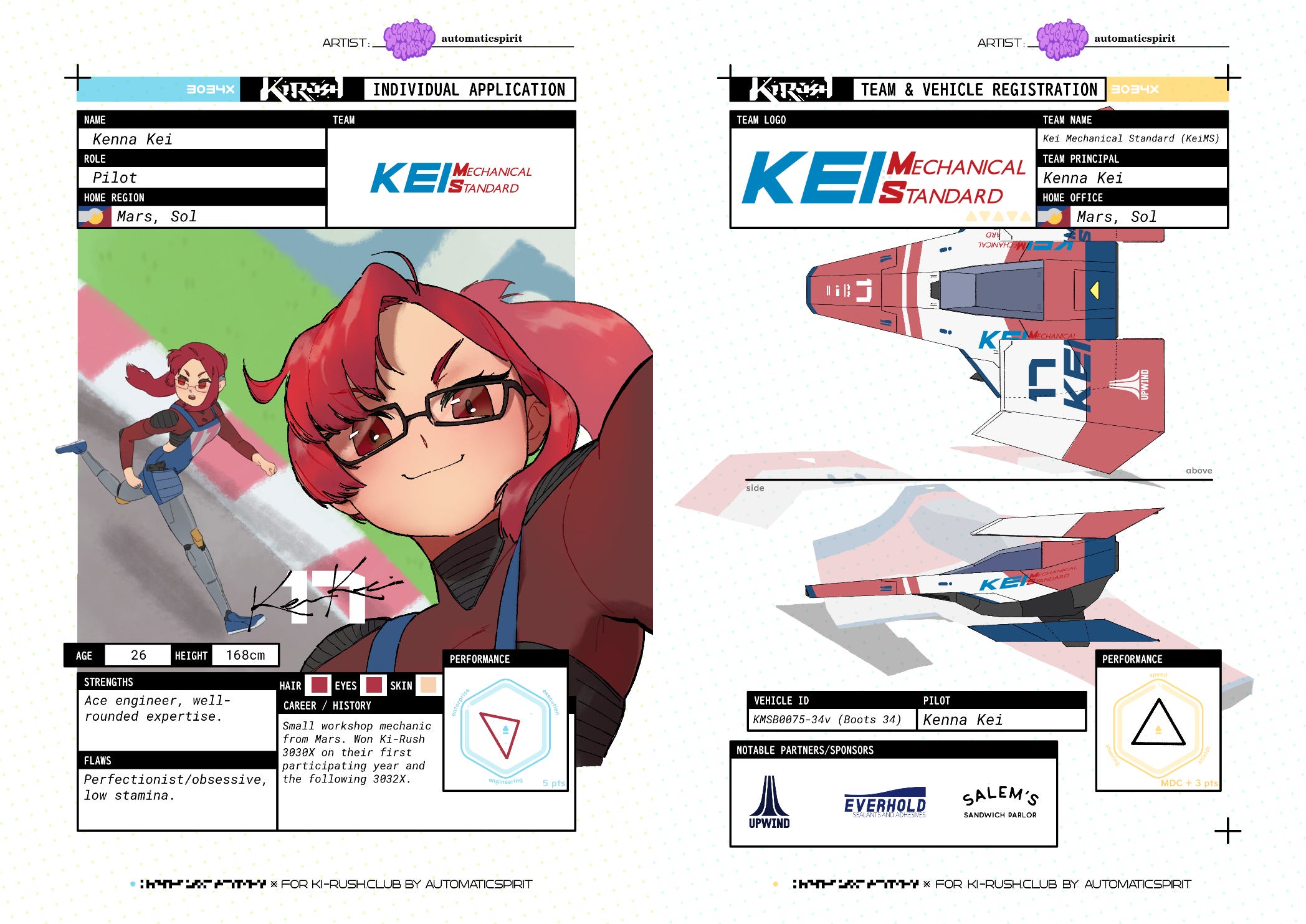In the story of Kenna and Boots, her ship is referred to as boots (KMS-b0075), her makeshift replacement to her legs as she plugs directly into it when piloting. It’s also important to consider the evolution of her racecraft, as even during tournaments she’s had to adapt and evolve, and now we’re at her sixth professional racing year and third Ki-Rush GP, so a lot of Boots’ design should have shifted to grow with Kenna too.