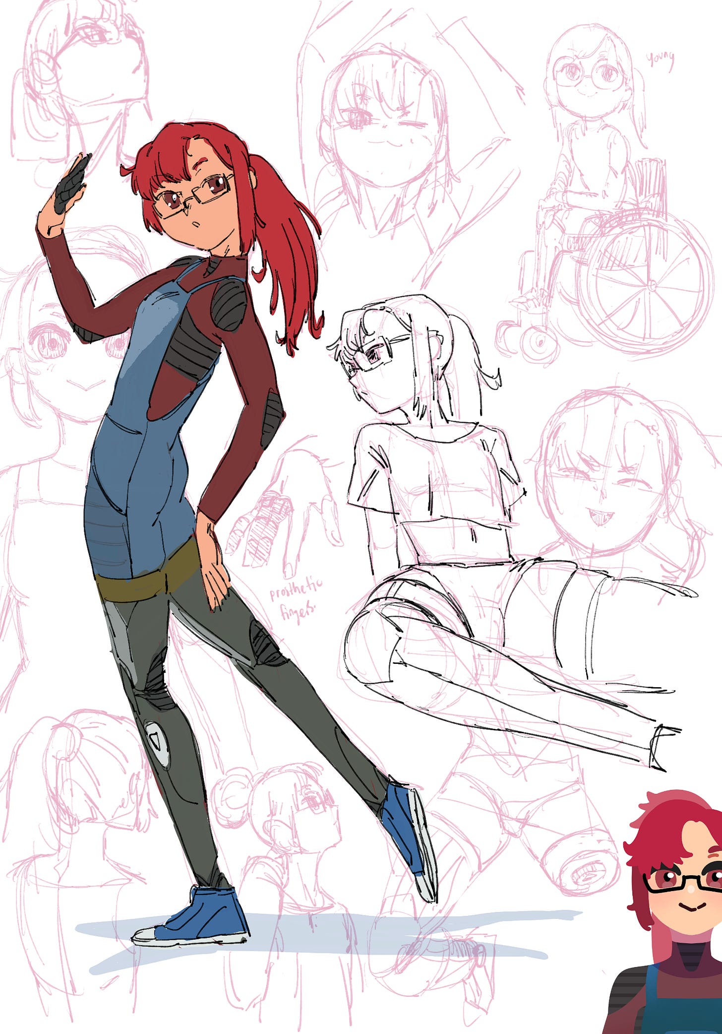Looking at her character sheet, she was always imagined as a character with glasses (which doesn’t really make sense? in a sci-fi setting), red hair, and as a character who has 2 prosthetic legs. She has a modified 2-piece version of the bubble suit (the racer suit) with overalls on top. I’ve never been happy with deciding how her robotic legs look, so I think there’s still experimenting to be done there. She sports the number 17: her father’s number from his first and only professional race.